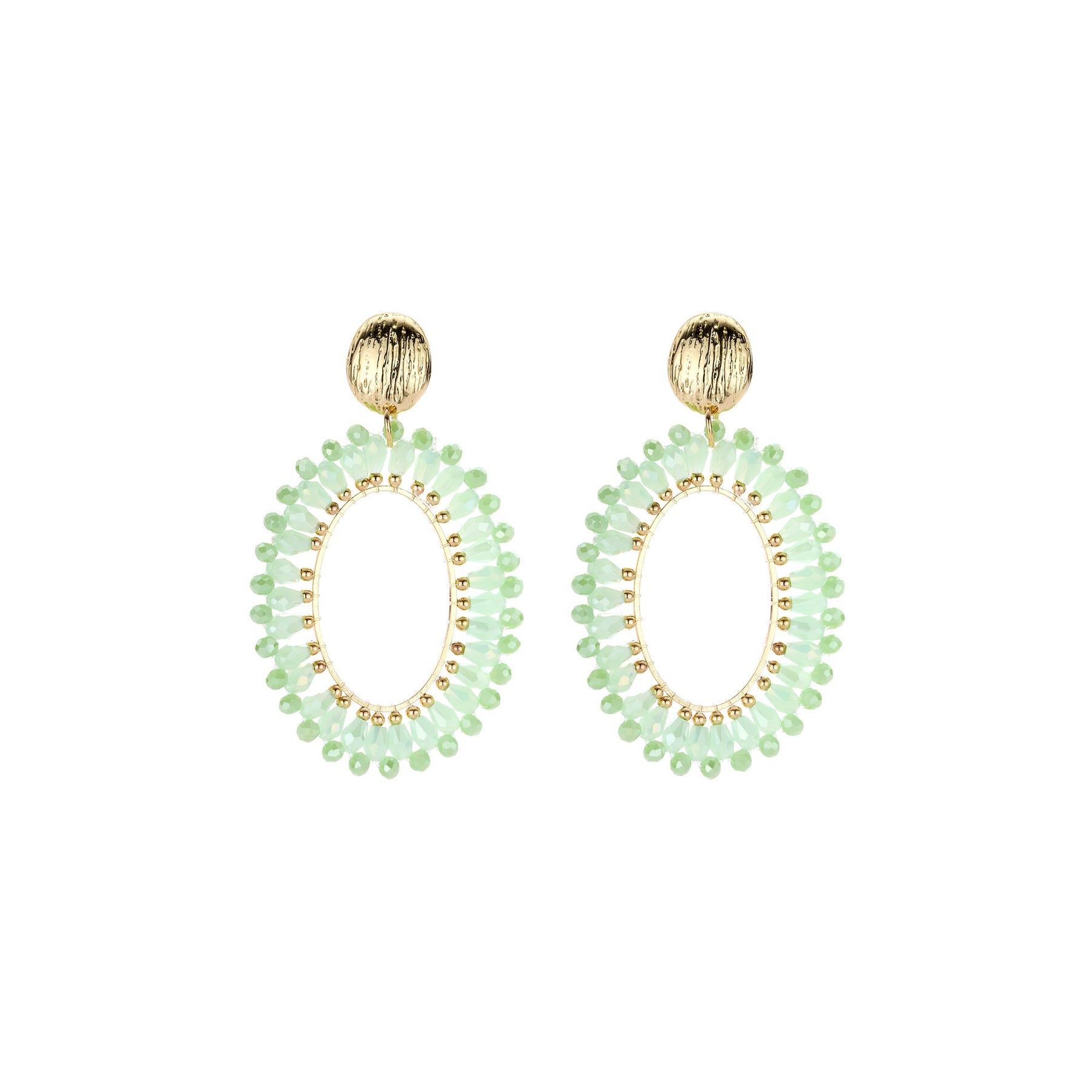 Elegant drop earrings featuring a light, open oval design adorned with finely arranged glass crystals. The faceted crystal beads form a delicate ring, creating a radiant sparkle with every movement.