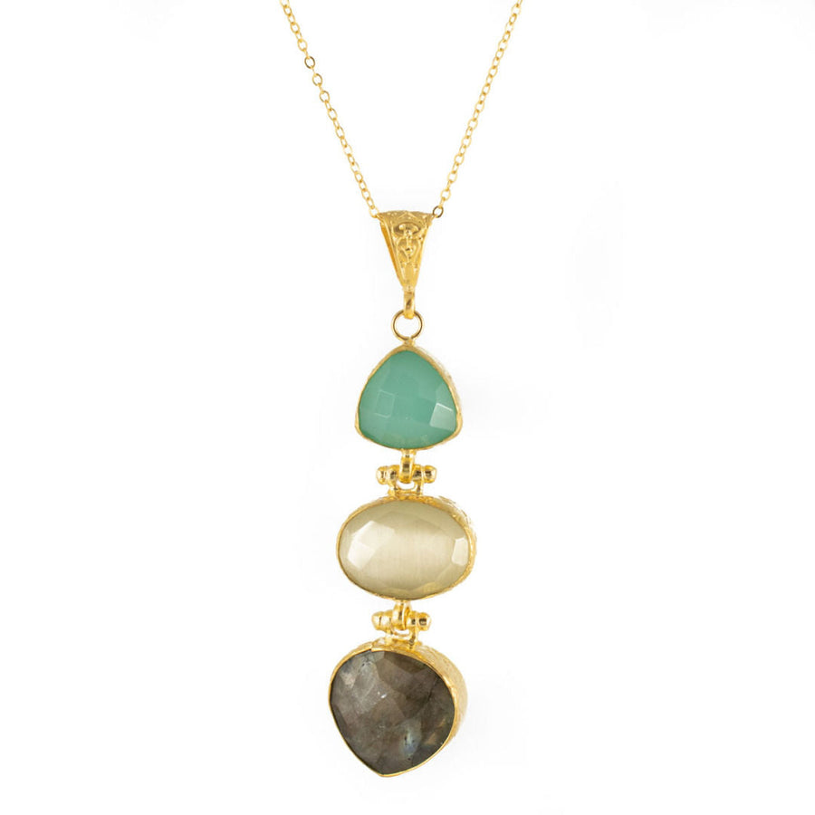 Kette Labradorit, AquaChalcedon dusty cateye und Messing vergoldet