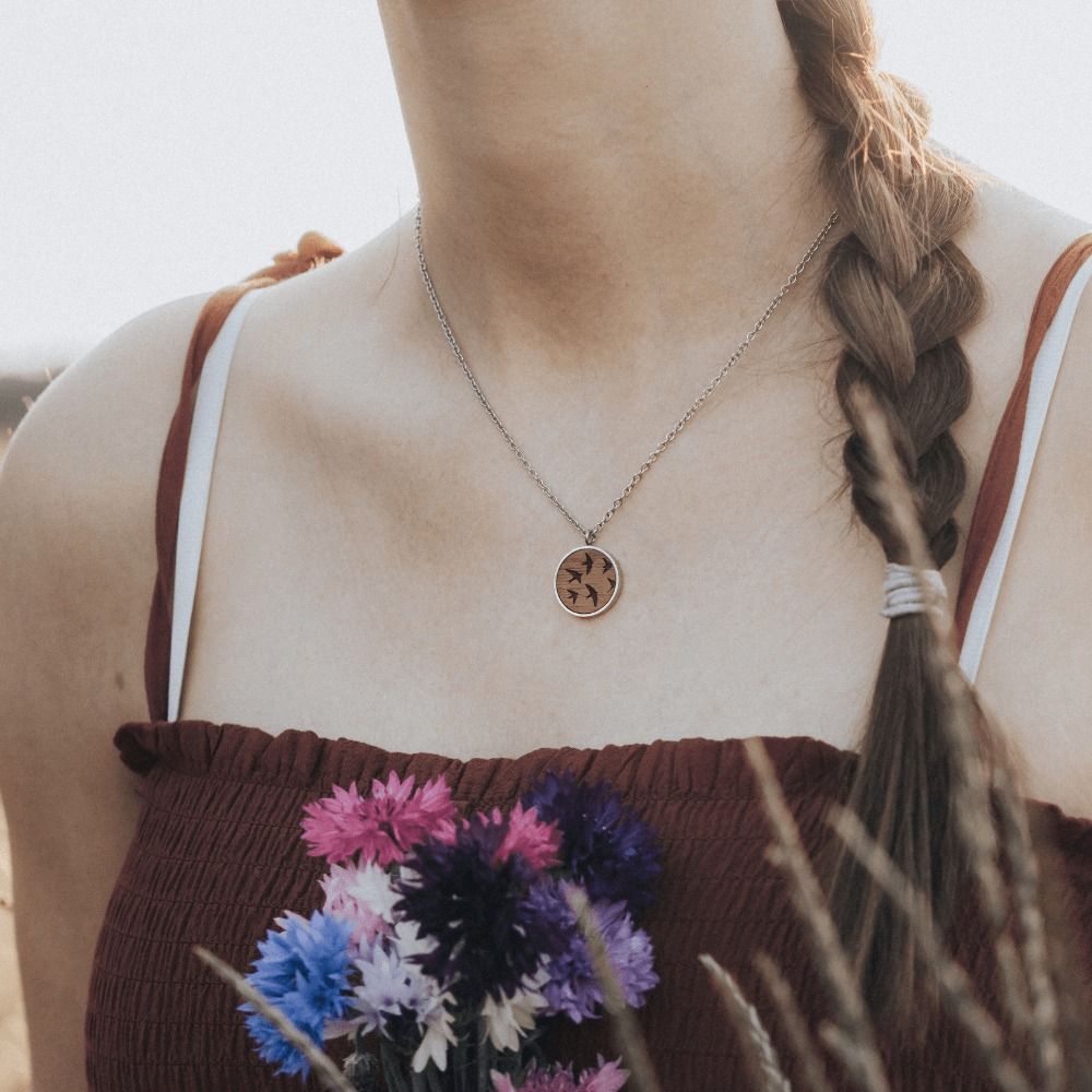 Vögel Halskette Skyla aus Edelstahl und Nussholz