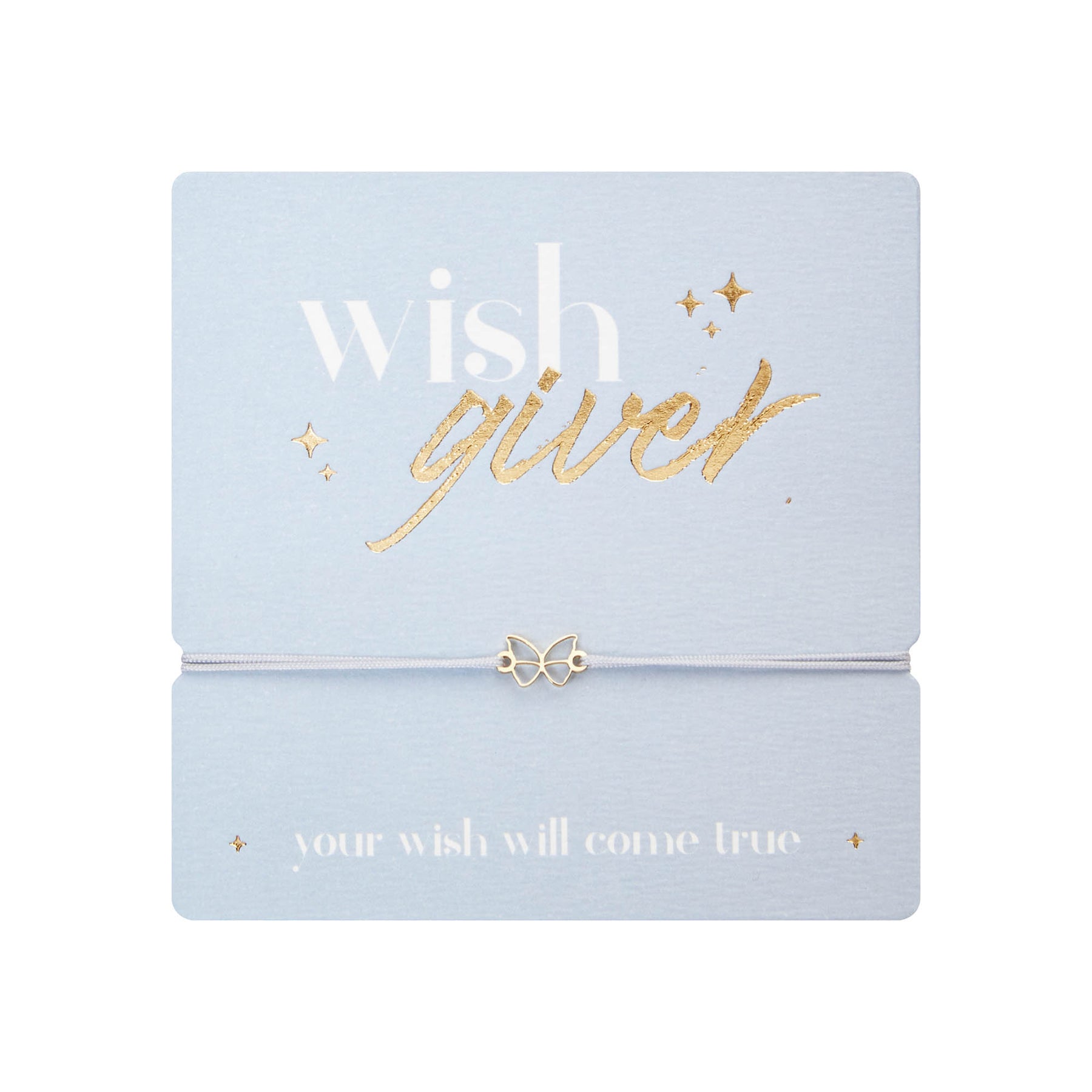 Feines Stoffarmband aus der Wish Giver Kollektion mit filigranem Schmetterlingssymbol. Der zarte Anhänger aus vergoldetem Edelstahl steht für Freiheit, Veränderung und neue Wünsche. Das elegante Stoffband in sanftem Hellblau lässt sich dank des verstellbaren Knotens individuell anpassen und sorgt für angenehmen Tragekomfort. Präsentiert auf einer dekorativen Karte mit der Botschaft „Wish giver – your wish will come true“ eignet sich dieses Armband ideal als kleines Geschenk mit besonderer Bedeutung.