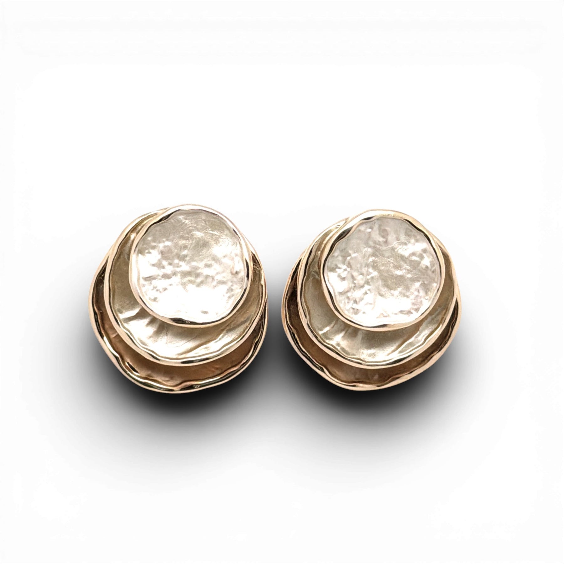 Elegant stud earrings featuring a multi-layered organic design in harmoniously combined natural tones. The refined gold-plated finish paired with hand-painted elements in cream, beige and warm brown shades creates a timeless and sophisticated look.