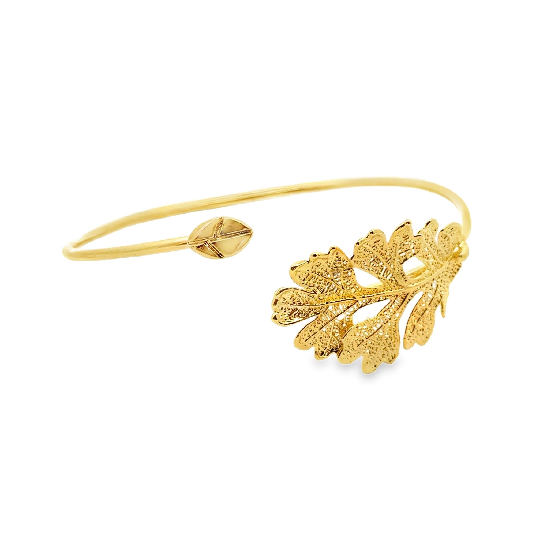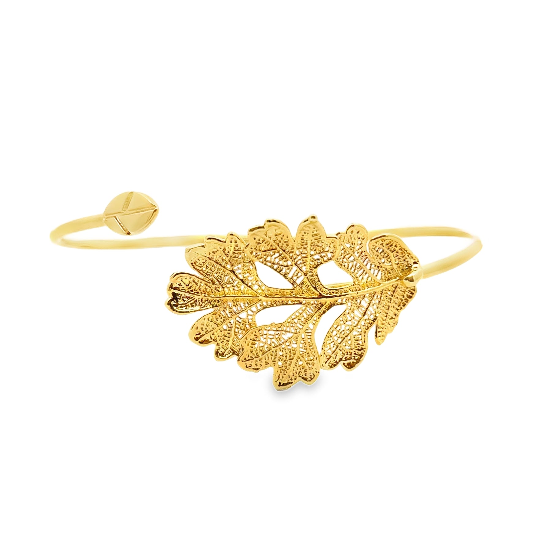 An elegant flexible bangle featuring a real oak leaf, carefully treated and gold-plated.