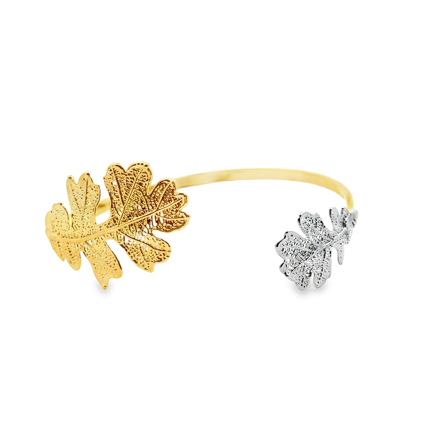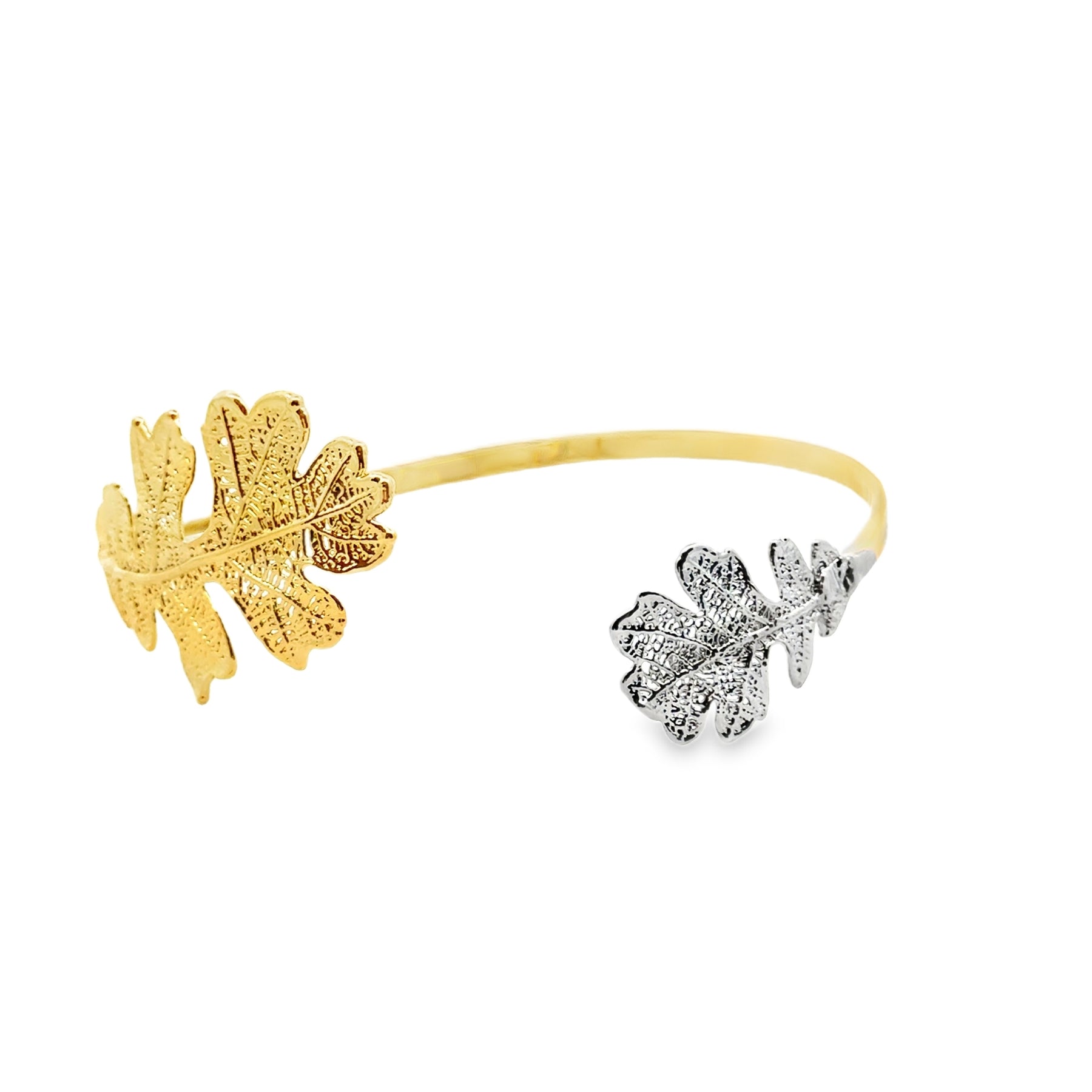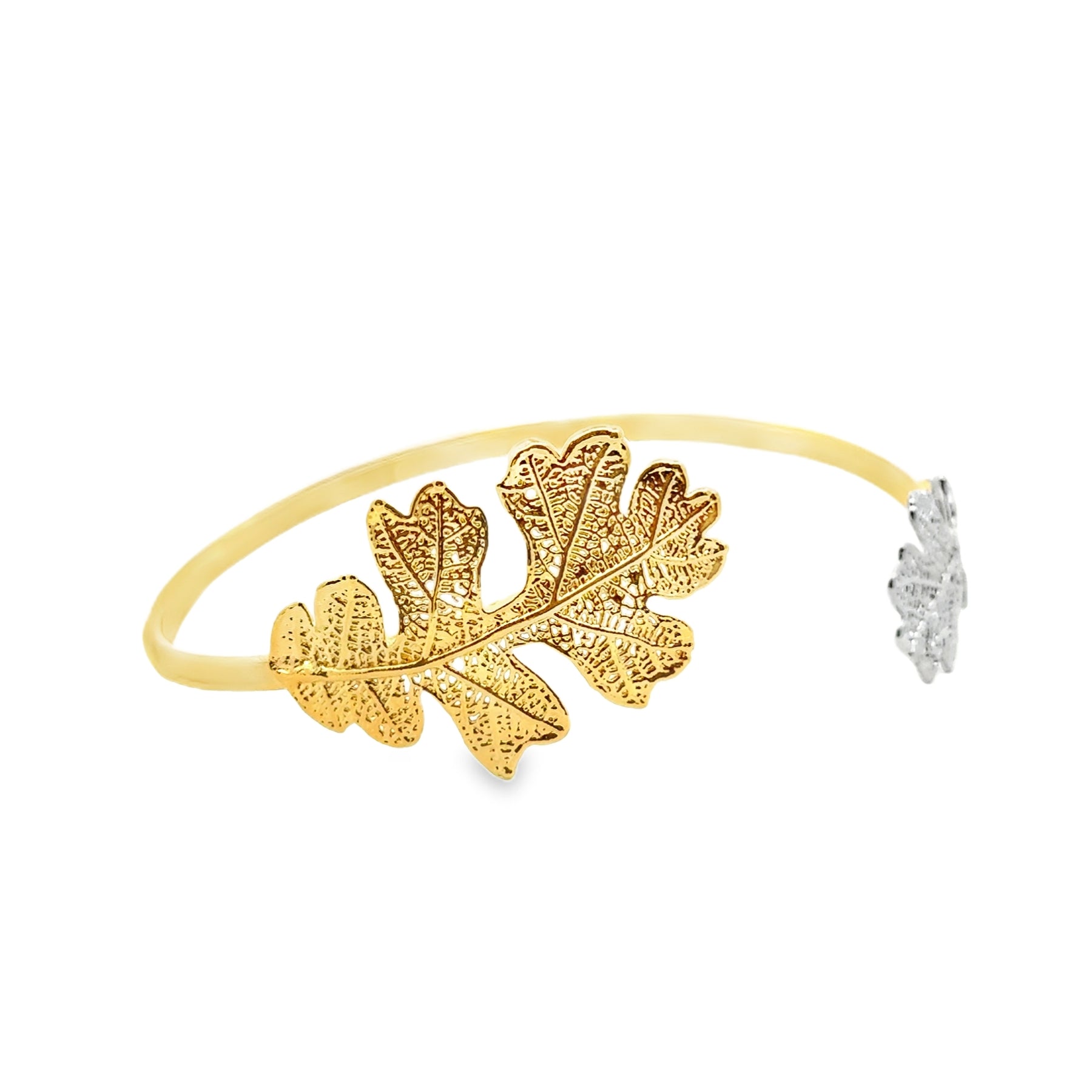 Two real oak leaves – one gold-plated, the other rhodium-plated – come together in a bangle that embodies timeless strength and elegance.