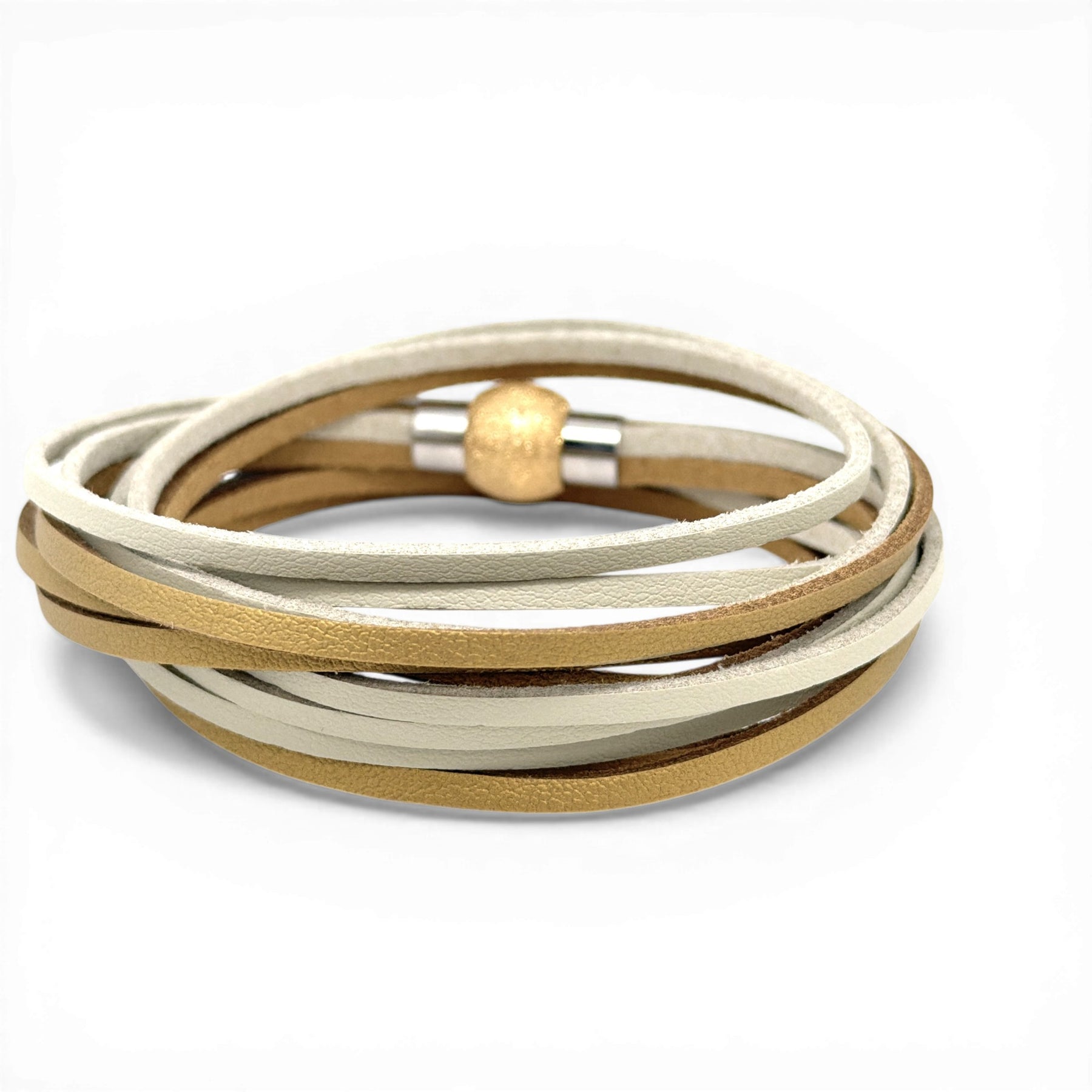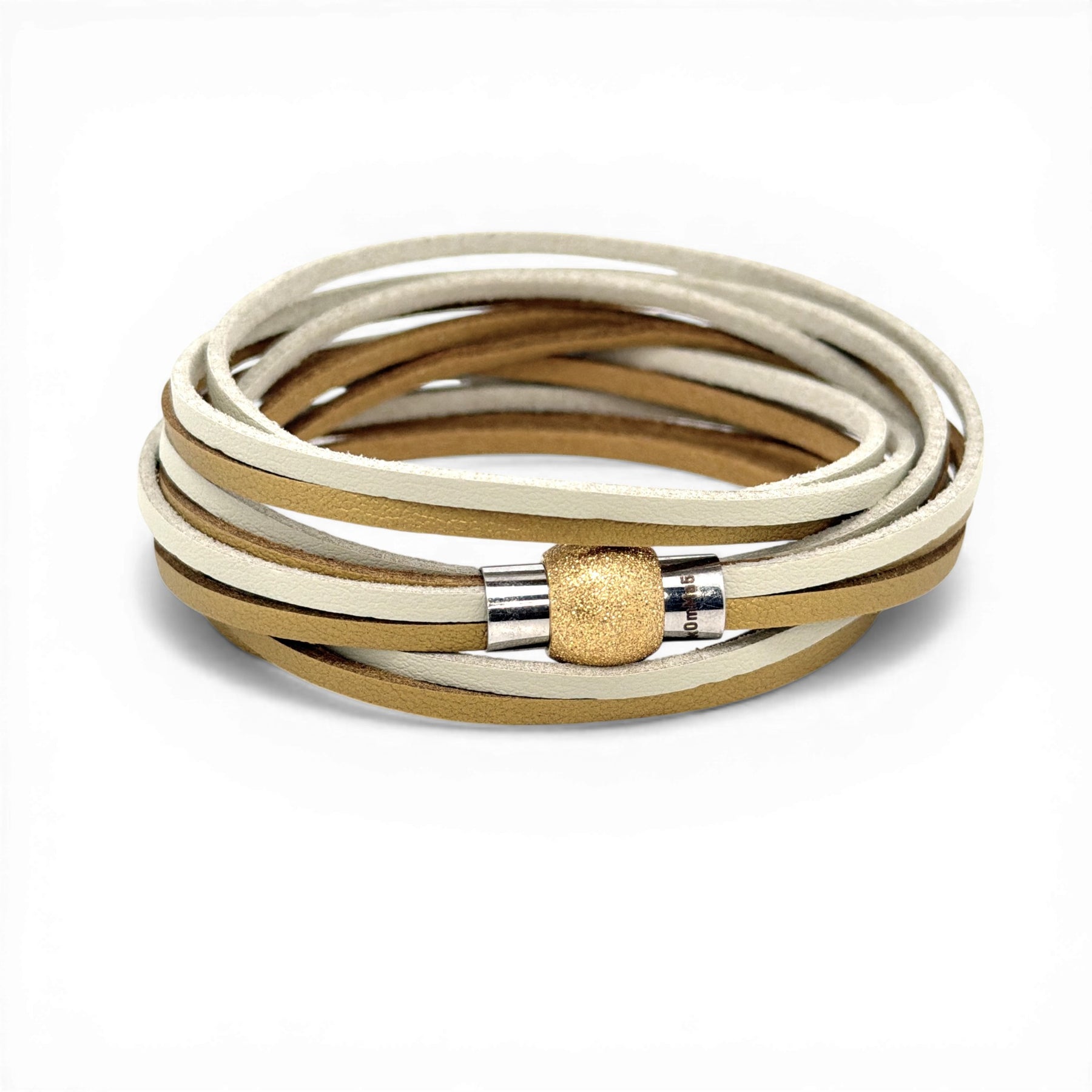 Bracciale kOmMa5 „Serena“ in similpelle di alta qualità con 6 cinturini in tonalità naturali armoniose. Il design doppio giro crea un look moderno, stratificato e ricco di carattere.
