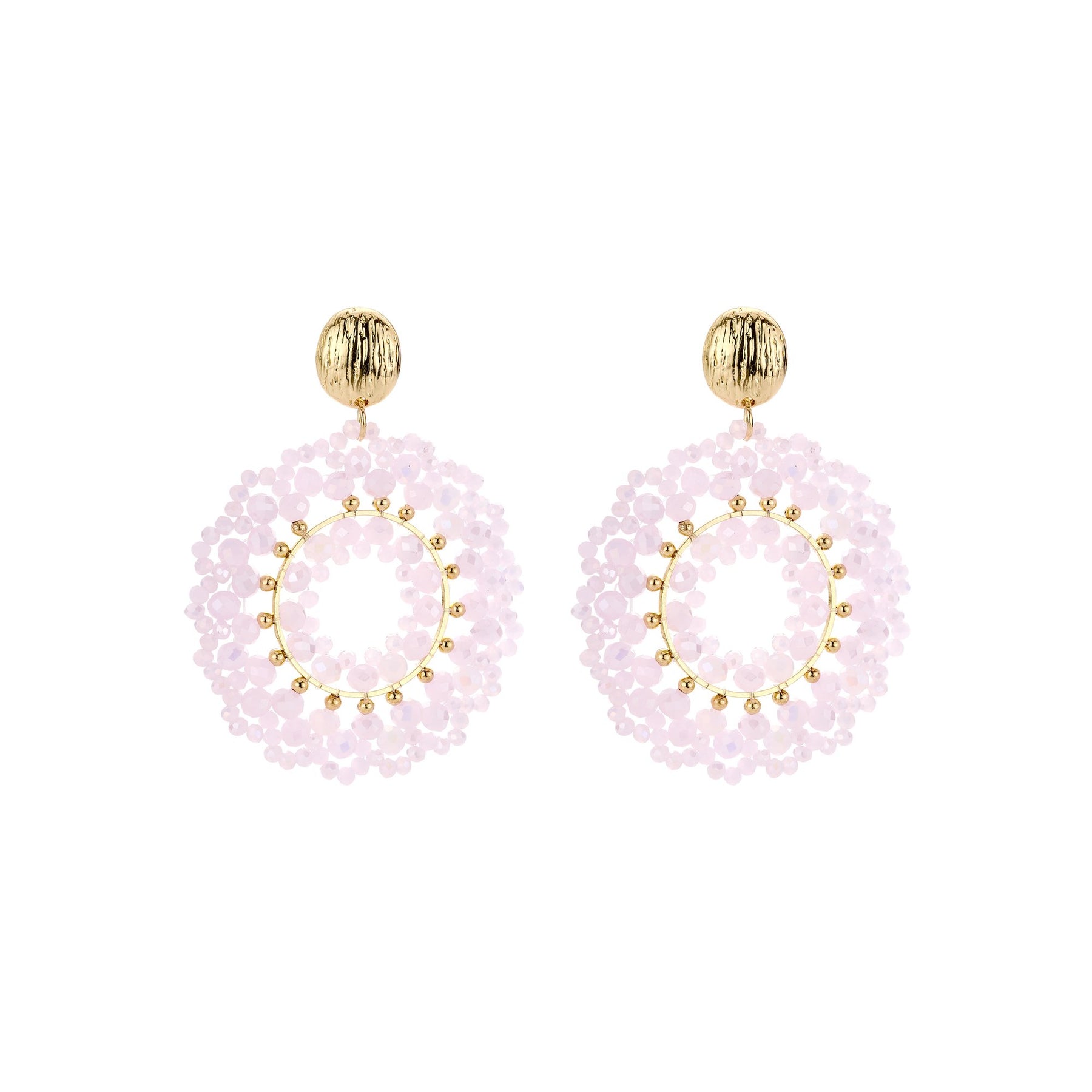 Striking drop earrings in a modern circular design, adorned with numerous glass crystals. The faceted crystal beads surround the open center, creating a light and radiant look with a vibrant sparkle.