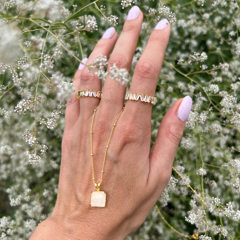 La nostra collana Manila è decorata con una pietra di luna bianca angolare, che si dice abbia un effetto molto speciale: si dice che aiuti a rafforzare la percezione e l'intuizione. Questo effetto molto speciale, ma anche la sua affascinante lucentezza bianca, rendono questa collana una delle preferite in assoluto nella nostra collezione Endless Summer. Abbiamo anche orecchini da abbinare alla collana.