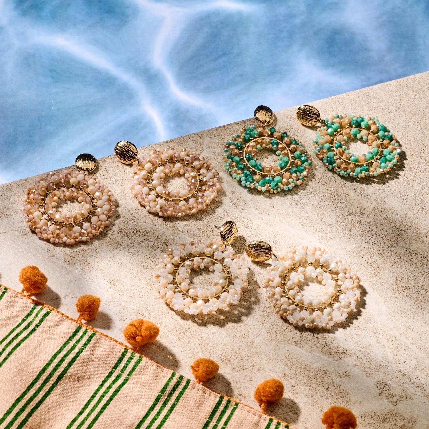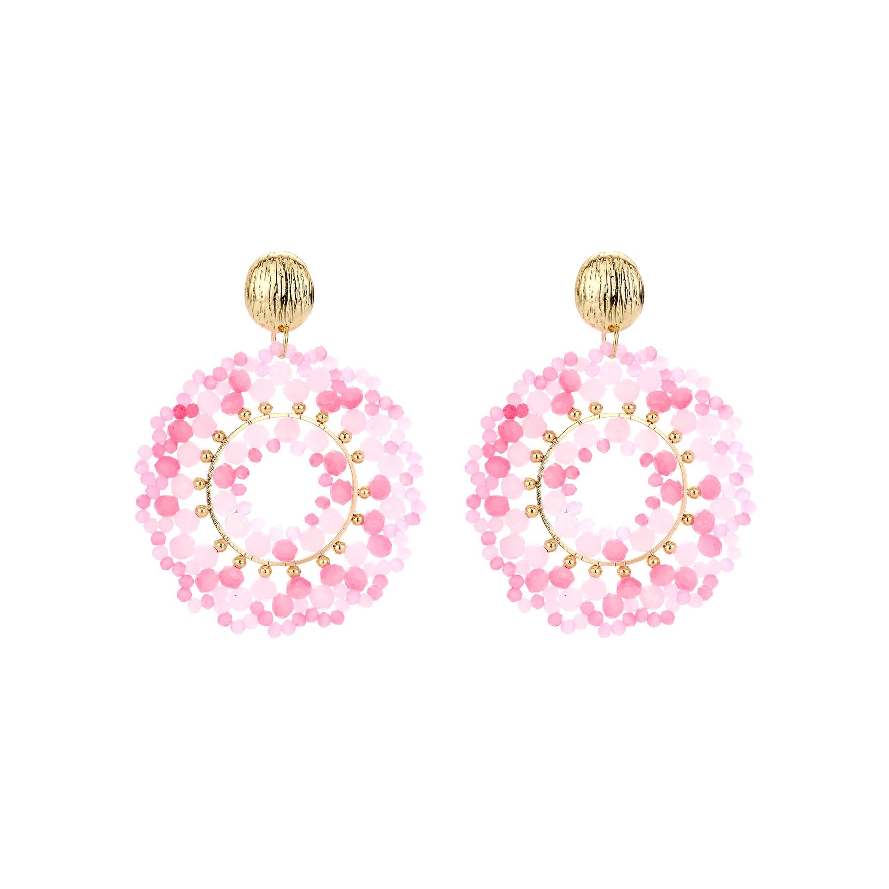 Striking drop earrings in a modern circular design, adorned with numerous glass crystals. The faceted crystal beads surround the open center, creating a light and radiant look with a vibrant sparkle.