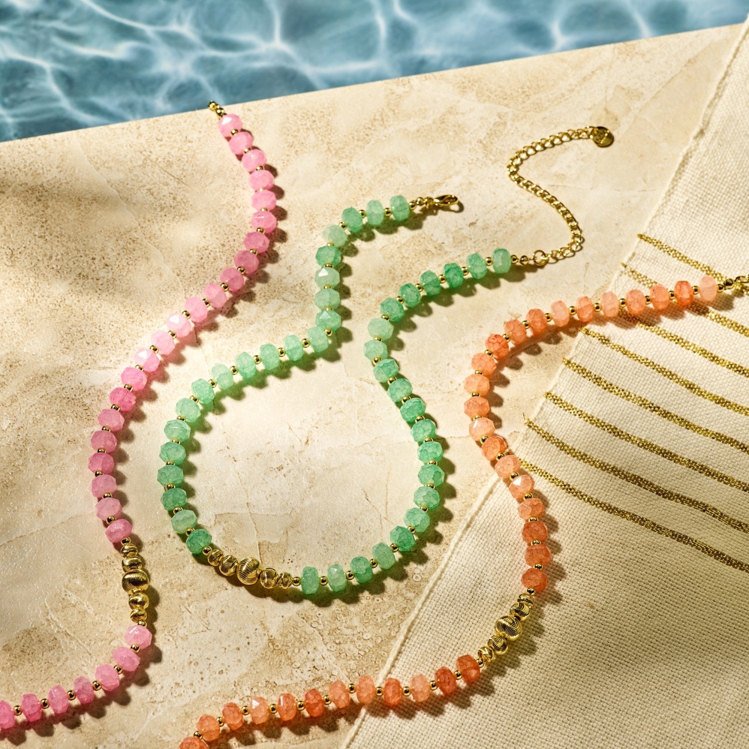 The glass beads give the necklace a modern and lively appearance, making it perfect for everyday wear and summer outfits. It can be worn on its own or layered beautifully with other necklaces.