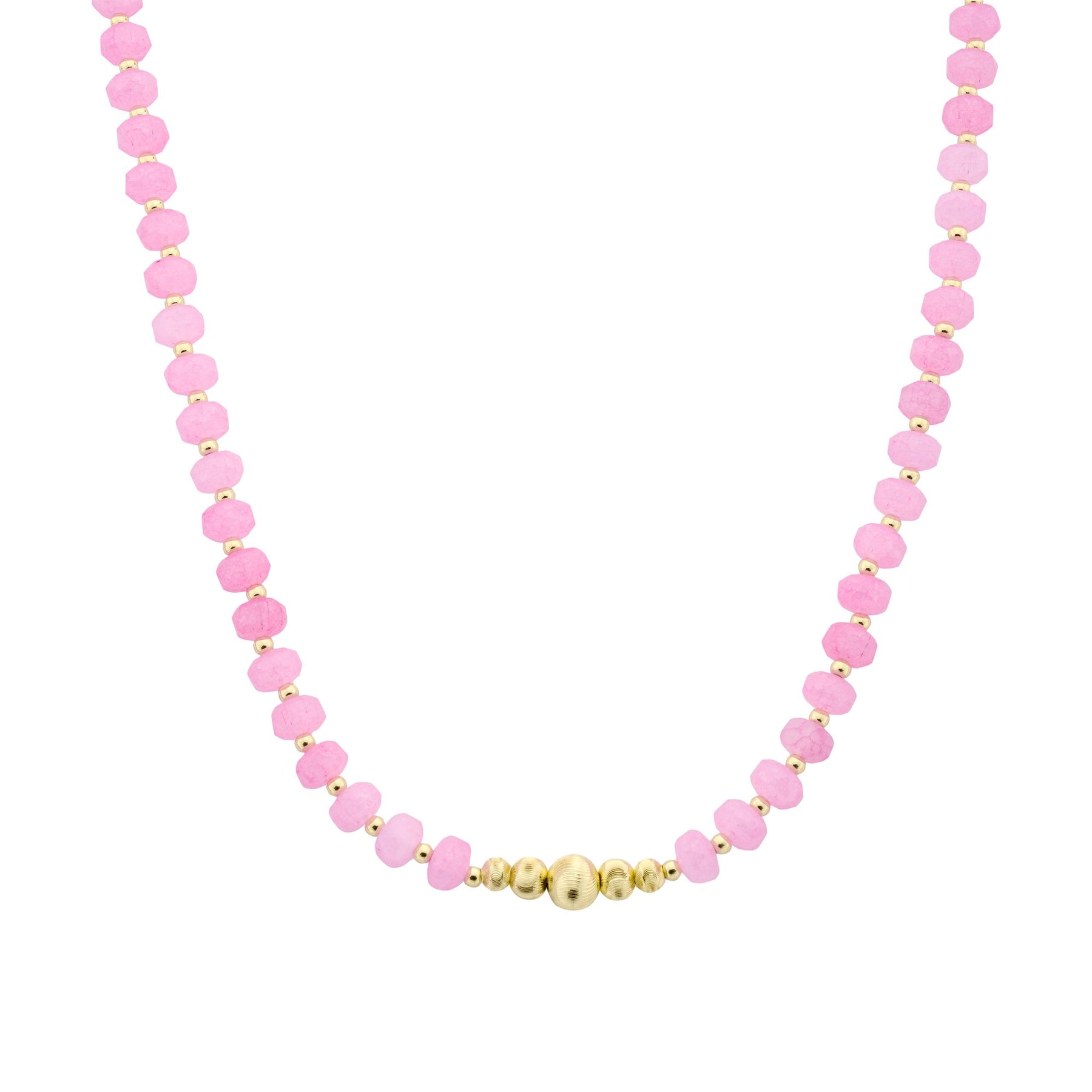 Feine Halskette mit facettierten Glasperlen in sanften, sommerlichen Farbtönen und dekorativen goldfarbenen Kugeln als stilvollem Mittelpunkt. Die Kombination aus zarten Glasperlen und glänzenden Goldakzenten verleiht der Kette eine leichte, elegante Ausstrahlung.