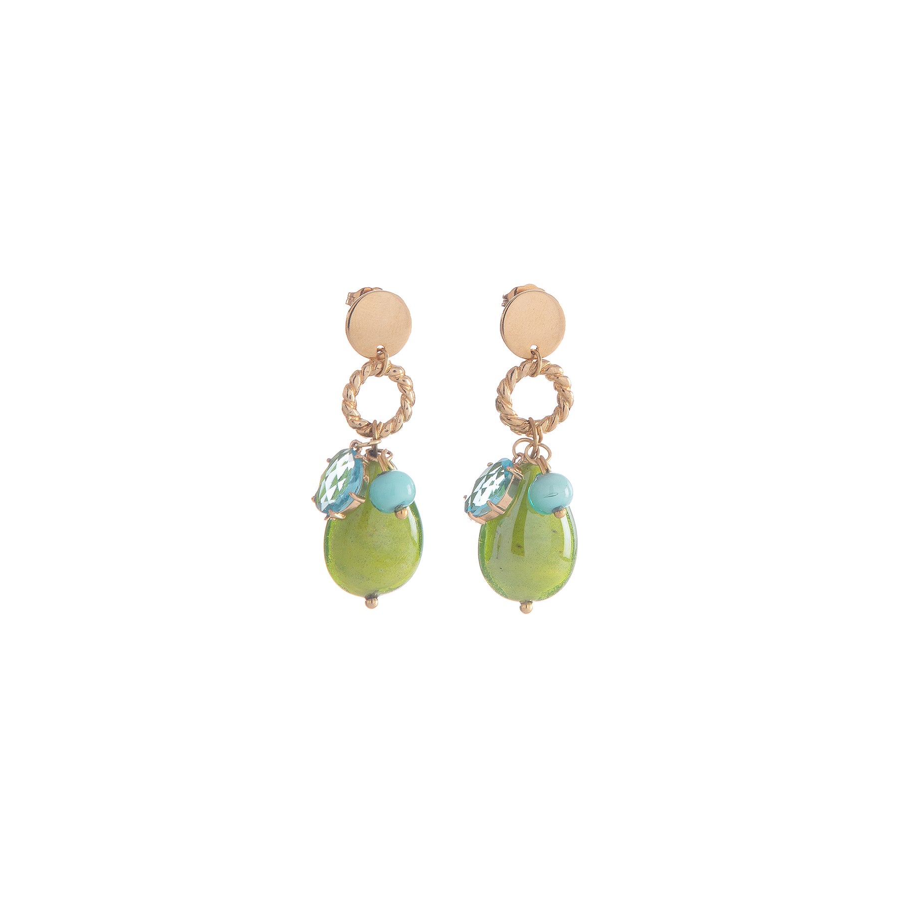 Eleganti orecchini pendenti color oro con elementi decorativi e pendente in vetro di Murano nei freschi toni del verde. La combinazione di cristalli sfaccettati e forme morbide crea uno stile moderno e luminoso.